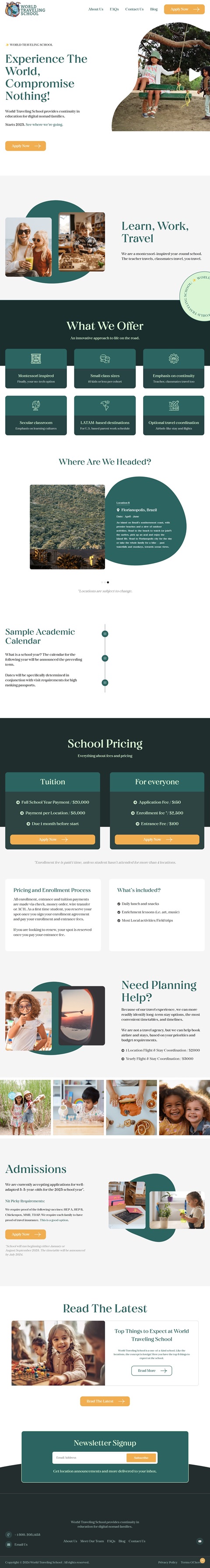 World traveling school is a Montessori-inspired year-round traveling school providing continuity in education for digital nomad families. Teachers, classmates, school and parents all travel. The school travels to 3 locations a year across LATAM to cater to parents' US/Canada-based work schedule.This screen-free worldschooling option gives students consistent in-person social connection for stronger bonds, requires less acclimatization and no educational compromise moving place to place. Parents can rely on the same incredibly conscientious team, while traveling the world.World Schooling